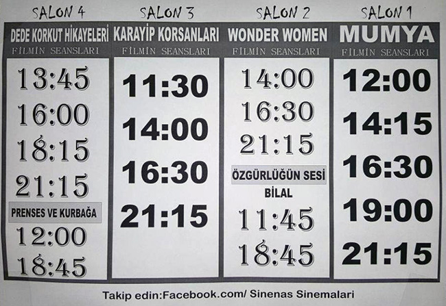 Karaman çarşı merkezinde yer alan Sinenas sinema salonunda, Mumya ve diğer filmlerin seansları şu şekilde